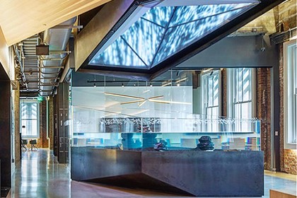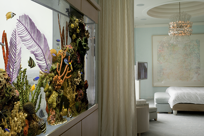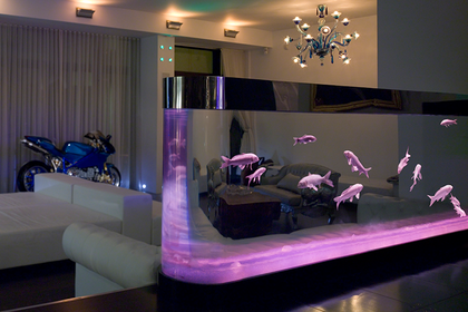 Inspired by Battlestar Galactica, designer Justin Muir created this large fifteen foot long koi installation. The bull nosed aquarium features fiber optic lighting, chrome and wenge finishes, crystal bead substrate, and color changing platinum ogon koi.