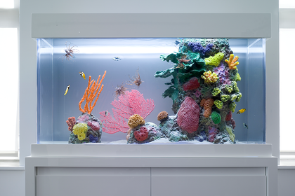 Stand alone four hundred gallon salt water fish installation. Museum bonded acrylic aquarium with hand made reef sculpture done in natural colors and purple sea plumes. Cabinet in white cerused oak with elevated base and minimal cap.