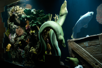 One of several aquarium installations for a themed restaurant. The display features coral reefs, green moray eels, large groupers, and a shipwreck.