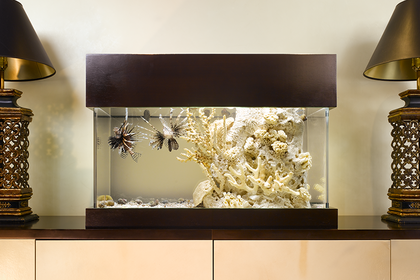 It's all about the Scorpionfish. Ebonized cabinet in ash wood and parchment wrapped panels and sterling silver pulls. Interior signature white reef sculpture with custom-cast corals, lion fish, and rhinopias.